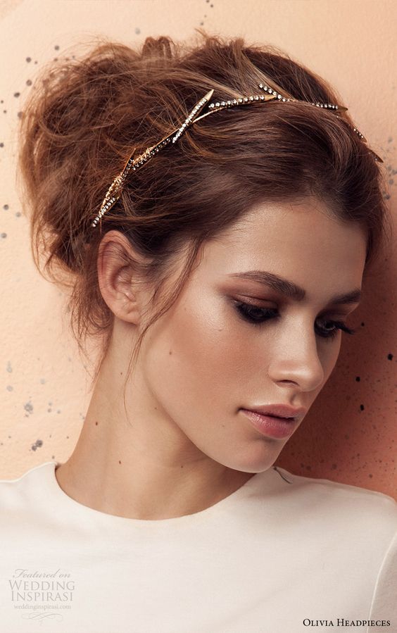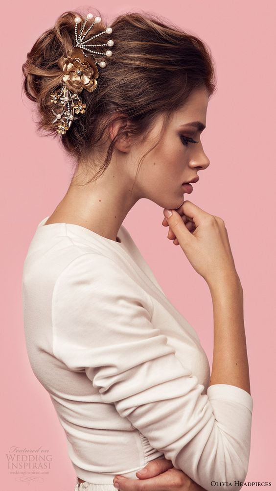The tenth hairstyle brings us back to classic glamour with a luxe golden hair ornament enhancing a textured updo. This updo is befitting for a formal or black tie wedding, offering a sophisticated and elegant look that’s sure to turn heads. The floral and pearl details add a luxurious touch to medium or long hair, making it a perfect choice for an evening event where glamour is key.