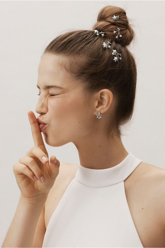 Taking inspiration from the night sky, the twelfth hairstyle elevates the classic high bun with starry accents. This updo is whimsical yet formal, making it a suitable choice for an evening or black tie event. The small starry pins scattered throughout the bun add a magical touch to long hair, creating a celestial theme that’s perfect for a night under the stars. It’s an easy yet enchanting style that’s sure to garner compliments.