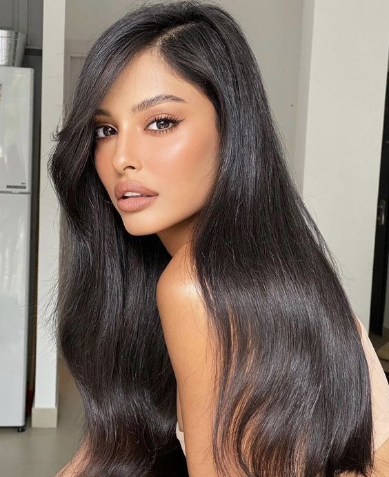 The fifteenth style celebrates the natural beauty of long, straight hair with a healthy, lustrous sheen. This unstyled look is for the guest who embraces simplicity, highlighting black hair that’s thick and full of life. It’s perfect for a beach or outdoor wedding, where the natural beauty complements the environment. This is a nod to the effortless beauty that requires minimal styling, proving that sometimes less is more.