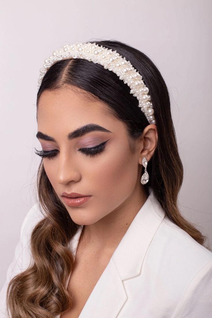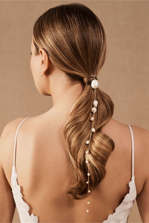 For those with long hair, the pearl-studded headpiece in our second image brings a regal charm that’s fit for a formal or black tie event. It’s a statement piece that transforms long straight or wavy hair into a work of art, with pearls adorning the hair like a crown. The style speaks of luxury and is ideal for an evening or night wedding where opulence is the theme of the night.