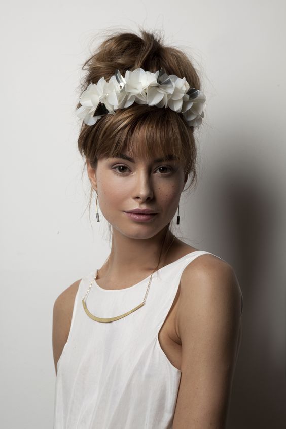 For a spring wedding or a whimsical garden affair, the white flower crown updo presented in the seventh style is a dreamy selection. This look combines medium shoulder length hair with a playful crown of white blooms, creating a youthful and fresh appearance. It’s a lovely choice for those who prefer a simple yet stylish approach, and it can be easily adapted for a diy look or a more curly hair texture.