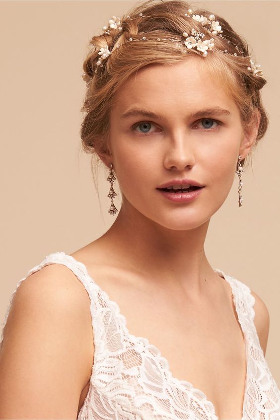 The third hairstyle is a modern twist on romantic aesthetics. An embellished halo sits atop wavy hair, perfect for a medium length cut. This style adds an air of romance and is suited for both indoor and outdoor weddings. It would look at home in a garden setting or during a spring wedding, where the blossoms echo the floral accents of the headpiece.