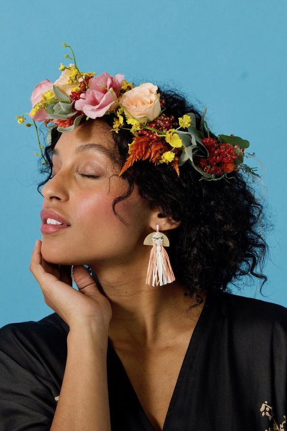 Embrace nature’s beauty with an enchanting half updo crowned with a vibrant array of flowers. This style exudes a bohemian spirit, perfect for the bride who finds solace in the outdoors. The cascading blooms in hues of pink, peach, and yellow breathe life into the soft curls, making it an ideal choice for a spring garden ceremony.