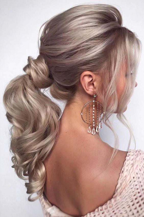 Embrace modern luxury with a voluminous ponytail that cascades into perfect waves, a chic example of wedding updos for medium length hair. This style is an epitome of contemporary elegance, suited for the minimalist bride who desires a blend of simplicity and sophistication.