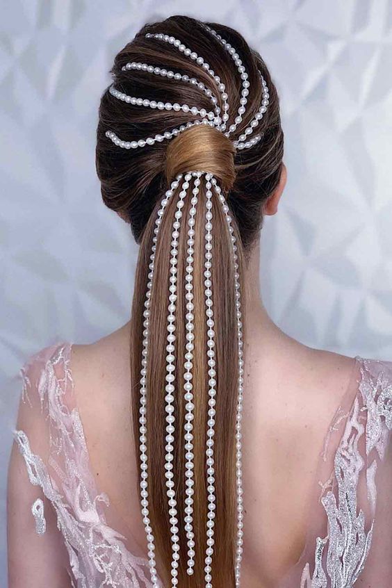This hairstyle is a masterpiece, where each pearl is placed with intention, creating a tapestry of elegance on a canvas of medium hair. It’s a look that’s perfect for the bride who is a connoisseur of fine details and understated glamour.