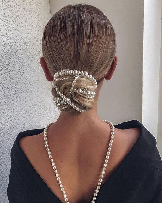 Here’s a style that combines easy updos for medium hair with the timeless elegance of pearls. This look is for the bride who delights in the allure of simplicity, a short hair updo that speaks volumes of class without saying a word.