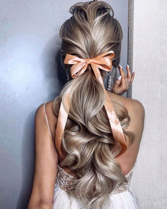 Embodying the essence of romantic narratives, this long hair style adorned with a satin ribbon is poetry in motion. It’s a choice that marries 2024 trends with timeless femininity, ideal for a ceremony steeped in soft, pastel themes.