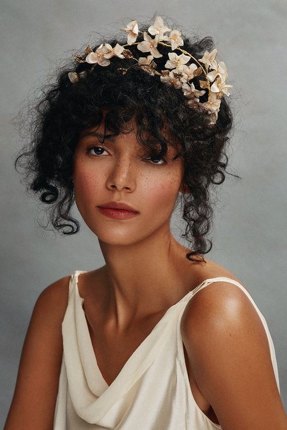 Channel the ancient beauty of a Grecian goddess with a coronet of golden leaves amidst a sea of soft curls. This upstyle is perfect for the bride seeking a blend of antiquity and modernity, adding an aesthetic touch to the medium with bangs hairstyle.