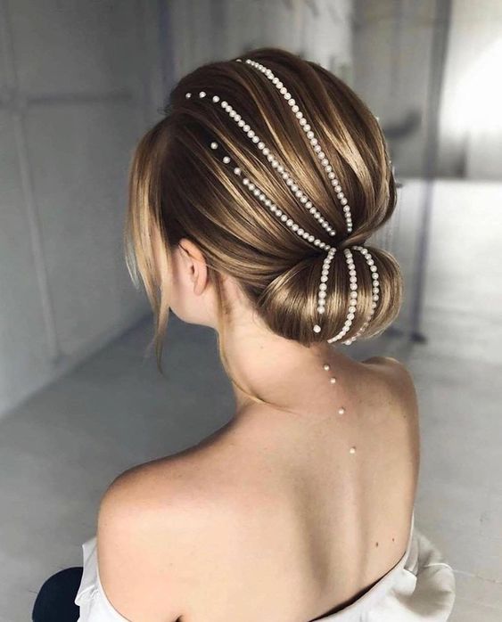 Ornament your wedding updo with the timeless sophistication of pearls. This sleek bun is not just a hairstyle; it’s a statement, incorporating medium length hair into a coiffure that’s both traditional and trendy. The delicate pearls add an air of aristocracy, making it a sublime choice for a formal wedding.