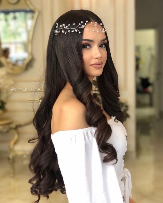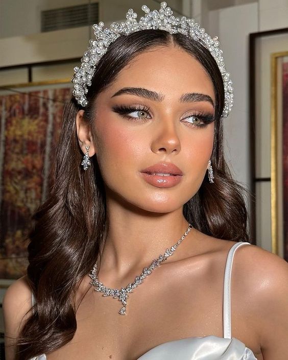 Flowing long hair graced with gentle waves is crowned with a bejeweled headpiece in this luxurious look. This style is perfect for brides who want to add a touch of sparkle to their wedding day ensemble, making it a fantastic choice for an evening affair.