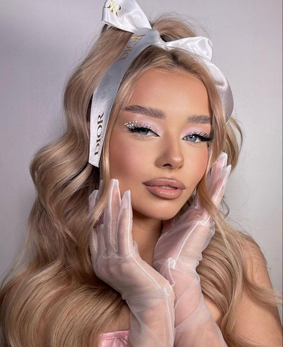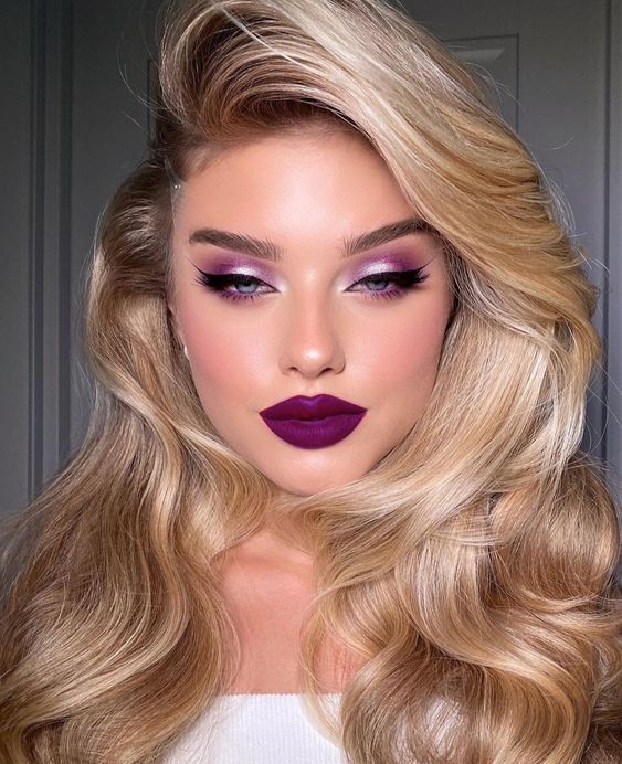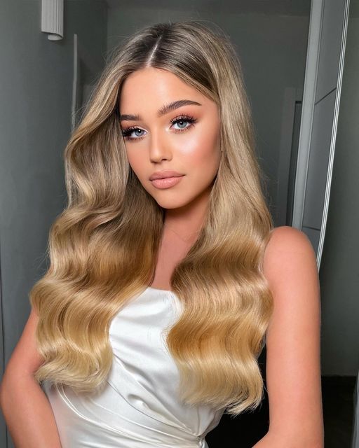 Bold red lips and a classic wave define this look. The long hair is styled with a deep side part and brushed into lustrous waves, reminiscent of a golden era Hollywood starlet – a style that’s both dramatic and timeless.