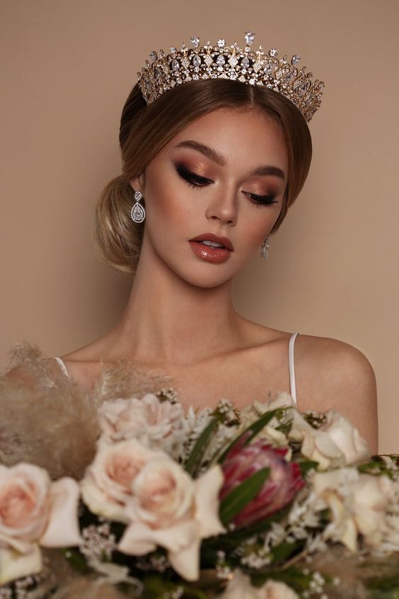 A straight hair style is elevated with a regal touch, featuring a stunning crown that makes a statement. This hairstyle is a modern take on classic elegance, perfect for the bride who dreams of a fairytale wedding.
