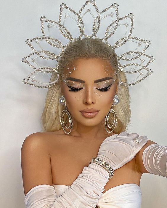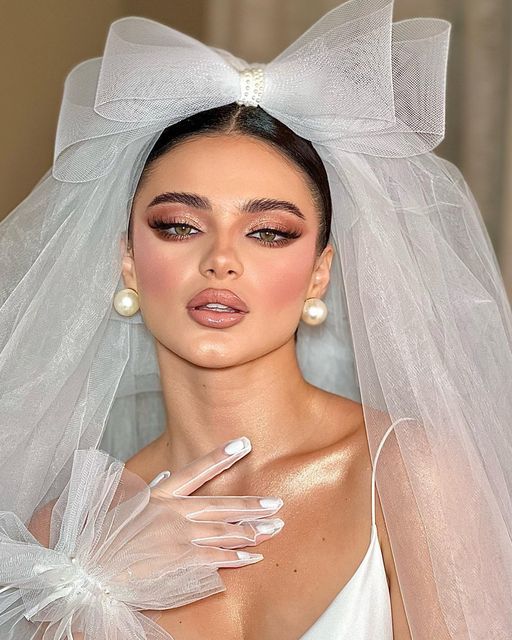 In this look, soft curls cascade down from beneath a pearl-studded tiara, giving the bride a dreamlike aura. It’s an ideal choice for those who fancy a romantic hairstyle that combines long hair with timeless beauty.
