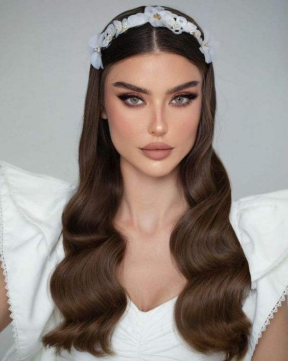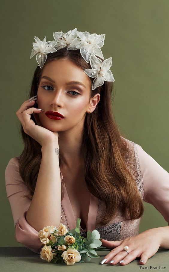Soft long hair is adorned with a crown of delicate flowers, bringing a dreamy, natural charm to this bridal look. It’s a romantic and whimsical choice, perfect for an outdoor or springtime wedding.