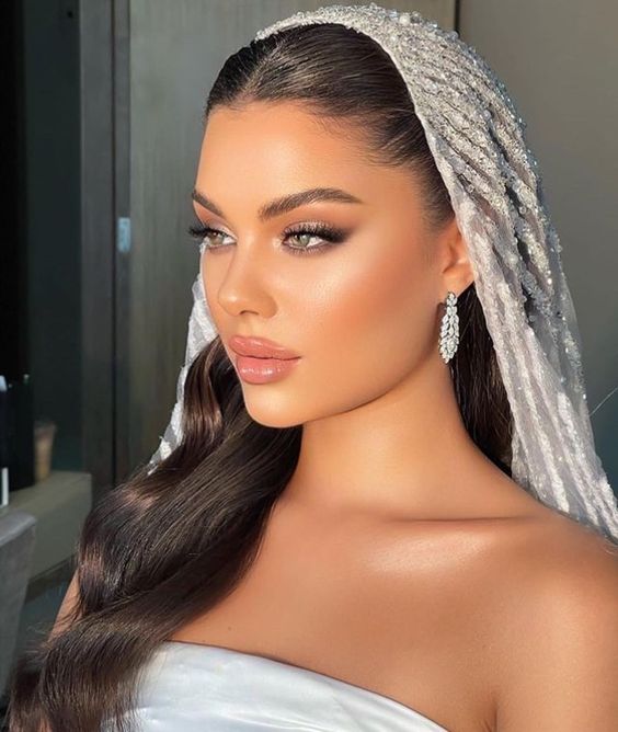 Adorned with a shimmering veil, this hairstyle speaks to the bride who wants to combine classic beauty with modern elegance. The long hair flows in lustrous waves, giving a sense of natural grace perfect for any season. With its soft curls, it’s an ideal choice for a summer or beach wedding, offering a look that’s as timeless as it is contemporary.