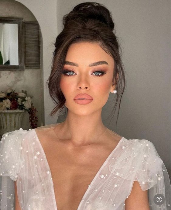 Elevate your wedding day look with this high bun that combines sleekness with volume. This medium with bangs hairstyle is perfect for the bride aiming for a look that’s both refined and on-trend. The straight hair pulled back into a bun showcases a back design that’s ideal for showcasing statement earrings or a detailed gown neckline.