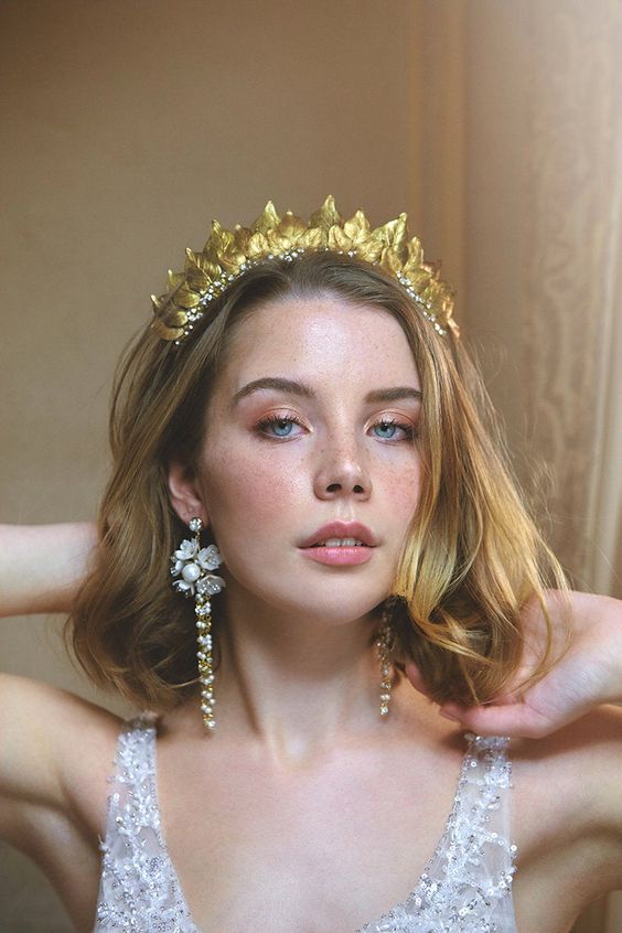 The embodiment of regal sophistication, this hairstyle captures the essence of wedding hairstyles for short hair 2024 with a golden laurel crown that adds a touch of Grecian elegance. The crown sits atop loosely curled hair, lending a soft yet majestic aura perfect for the bride or even the mother of the bride. This style proves that accessories can transform short hair into a statement of bridal beauty.