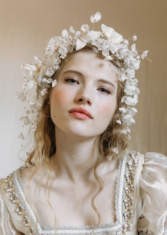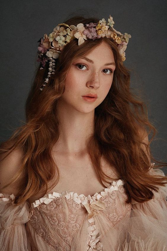 Bringing to life the rich tones of autumn, this hairstyle is a celebration of the season’s palette. The long hair is adorned with a crown of vintage flowers, adding a touch of nostalgia and romantic flair. This style is a beautiful choice for the bride or bridesmaid who wants to incorporate seasonal elements into her look.