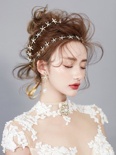 This look captures a celestial theme with star-like pins scattered through a loosely tied updo. It’s an ideal match for a bride who wishes for a hairstyle that is both playful and poised. The tendrils framing the face add softness, making it a fantastic option for someone with medium-length hair looking for a simple yet elegant ‘do for their special day.