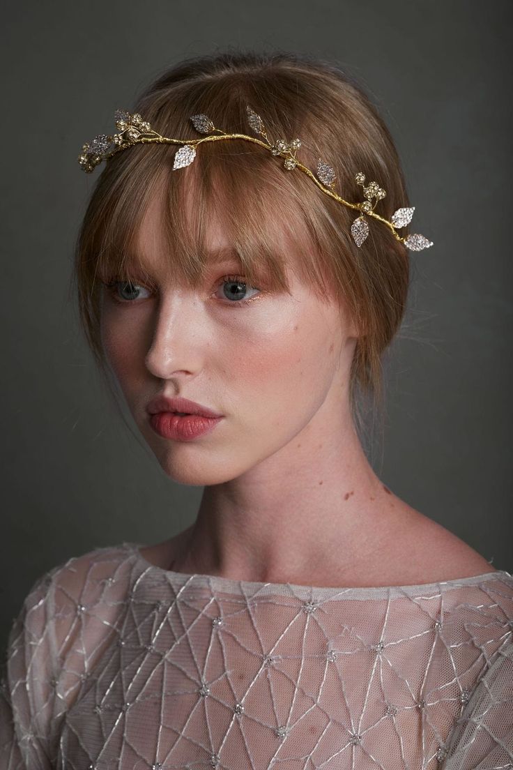 A touch of ancient Greece is reborn in this hairstyle, where a golden leaf headband crowns a soft updo. It’s a subtle statement for brides with fine hair, adding a hint of metallic brilliance without overwhelming the natural beauty. This style is a tribute to vintage elegance and would pair beautifully with a gown featuring Grecian draping or beading.
