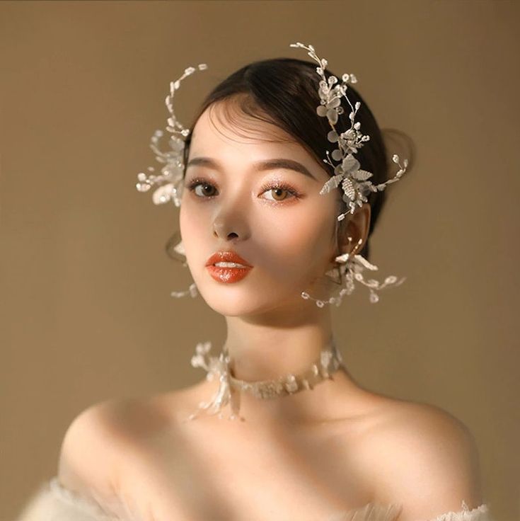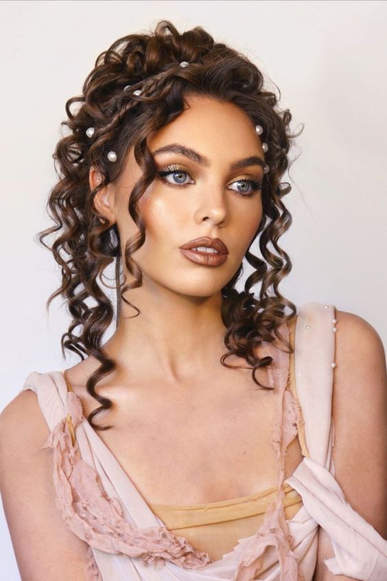 Here, curly hair is celebrated with abandon, adorned with lustrous pearls that catch the light and the eye. It’s a style that says both boho and luxury, making it a versatile choice for brides who want to combine a relaxed vibe with classic wedding opulence. It’s particularly flattering for long hair with bangs, giving a look that’s both framed and free-flowing.