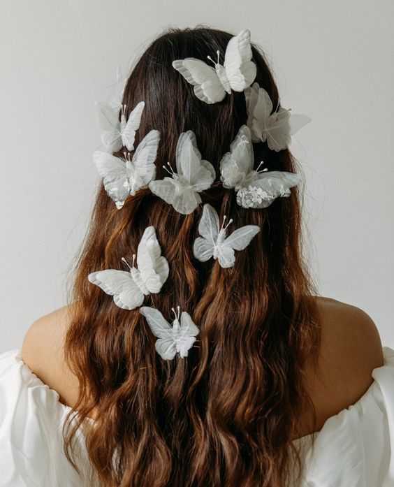 This hairstyle is a whimsical journey into an enchanted garden, with delicate butterflies appearing to alight in a cascade of waves. It’s a look that’s both magical and natural, perfect for the bride who wants her hairstyle to be a talking point. This style is stunning on long hair, especially with natural highlights that the butterflies can play amongst.
