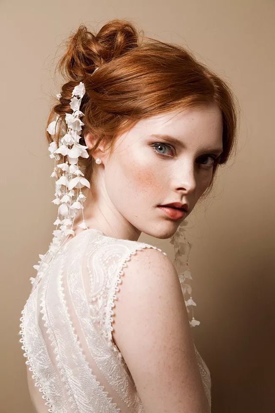 Redolent of a bygone era, this hairstyle is a nod to the classic 50s. A simple bun is elevated with a trailing, floral lace veil, adding a layer of formal sophistication to the bridal ensemble. It’s particularly flattering for red hair, as it showcases the rich hues and adds a vibrant warmth to the overall look.