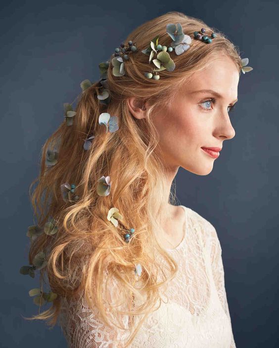 This hairstyle is a dreamy cascade of long hair, embellished with a whimsical mix of floral and foliage accents. It’s a perfect symphony of nature and beauty, ideal for a beach or garden wedding. The bridal or bridesmaid hairstyle is effortlessly elegant, offering a touch of ethereal charm.