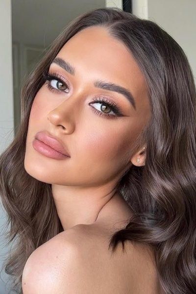 Blonde brunettes can embrace a softer version of glamour with this contemporary classic look. The warm, neutral eyeshadows accentuate the eyes without overpowering, and the glossy nude lip is the epitome of modern elegance. This makeup style is natural, simple, and effortlessly romantic, ideal for brides who prefer a subtle yet glamorous approach.