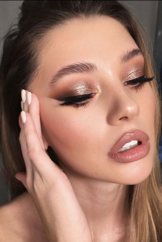 The luxurious combination of golden and bronze eyeshadows in this look brings a touch of glamour to wedding makeup for brown eyes. Ideal for the fashion-forward bride, the warm tones and reflective pigments are a nod to a natural fall palette, while the glossy nude lips keep the look modern and elegant. This style is a perfect choice for a bold bride looking to blend classic beauty with contemporary trends.
