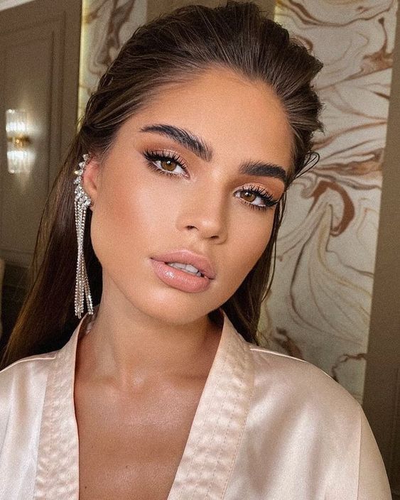 For the chic bride who adores modern romance, this makeup look combines fresh, flawless skin with a soft, smoky eye that beautifully enhances brown eyes. The delicate balance of warmth and coolness in the eyeshadows, along with a hint of gloss on the lips, makes this look both romantic and natural. It’s a style that speaks to bridal natural looks for brunettes, adding a contemporary twist to bridal elegance.