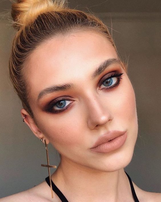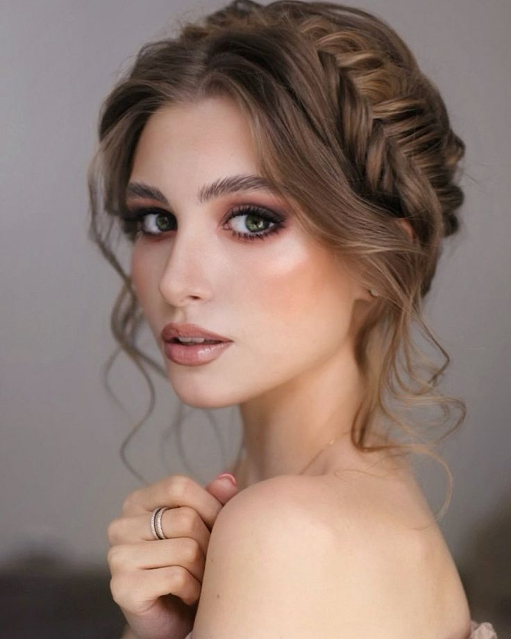 Soft smoky eyes paired with a nude lip create an ethereal beauty that is both alluring and angelic. It’s a look that plays on the 2024 trends of blended hues and subtle contrasts, perfect for the bride with for blue eyes brown hair who seeks a hint of mystery. The braided hair adds a touch of romanticism to the style, making it ideal for a traditional ceremony or a whimsical outdoor affair.