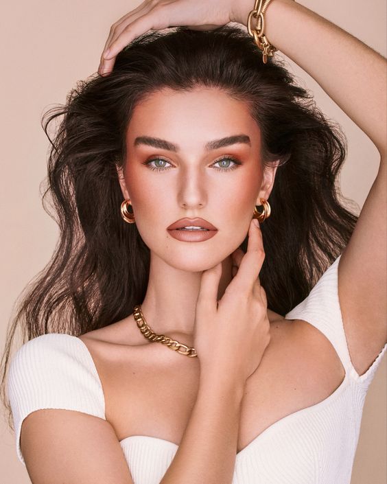 Fiery shades of orange and copper set this bold bride apart. It’s a trendsetting look that’s perfect for for brown eyes brunettes natural, embodying the heat and passion of her love. The robust tones are balanced with a nude lip, creating a look that’s both striking and balanced, suitable for a wedding filled with vibrant energy and contemporary flair.