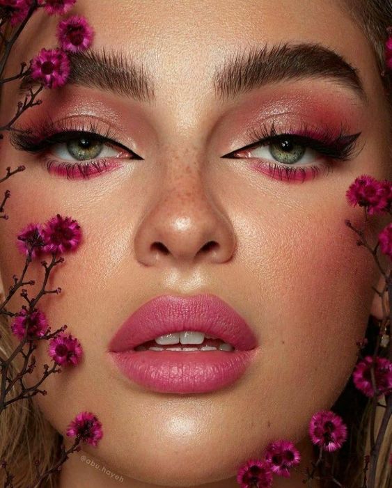 Spring weddings call for a palette inspired by nature’s bloom. This bride’s look incorporates the fresh pinks of spring blossoms, perfect for natural looks that resonate with the season’s joy. The pink eyeshadow complements for blue eyes, while the floral adornments in her hair echo the surrounding bloom, creating a harmonious symphony of color and life.