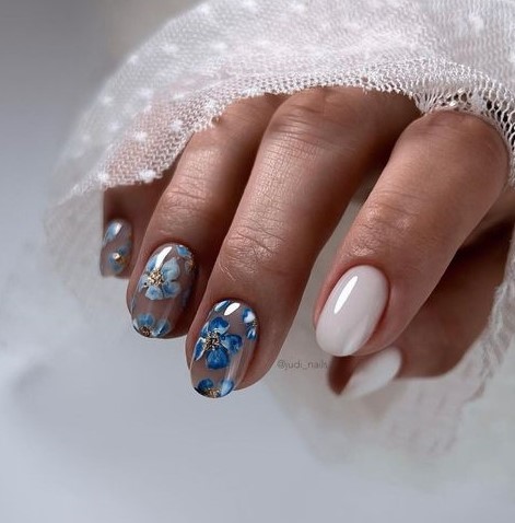Dive into a serene pool of pastel blues with this exquisite nail design. A touch of white blooms amidst the tranquil blue, creating a harmonious balance that echoes a bride’s dream. The simple yet sophisticated pattern of floral artistry brings forward a natural and cute appeal—perfect for the bride who carries the essence of spring beneath her veil. Each nail is a petal in the bouquet of the bride’s ensemble, adding to the ideas for the bride seeking a splash of color in her classic look.