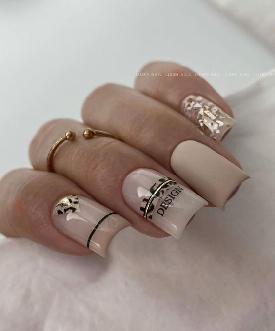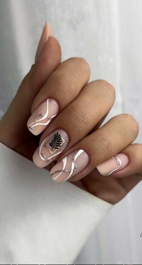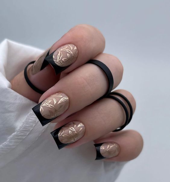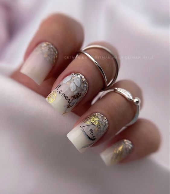 The warmth of gold on a nude base exudes timeless elegance. These nails flaunt a natural sophistication with a classic French tip dipped in gold. Leafy gold designs against the matte background are a nod to the fall season, suggesting a harmony with nature’s golden hour. This design offers a natural and classy bridal vibe, perfect for an autumnal ceremony or for adding a touch of gold to the traditional.