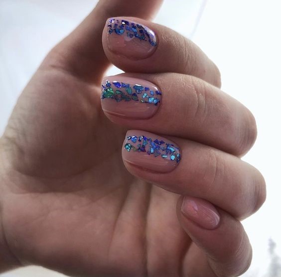 Capturing the festive spirit of a wedding celebration, these nails are sprinkled with glittering blue and silver confetti. The playful sparkles evoke the joyous tears and laughter that fill the air on the big day, making it a cute and dreamy choice for a bride who loves a touch of whimsy.