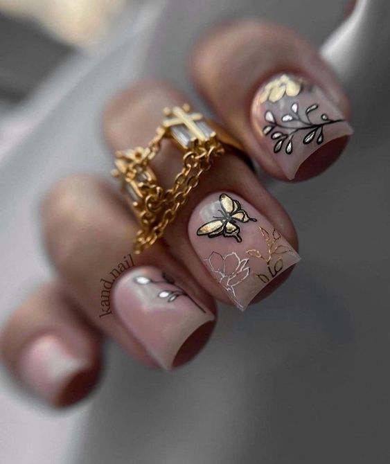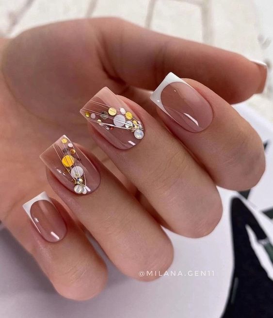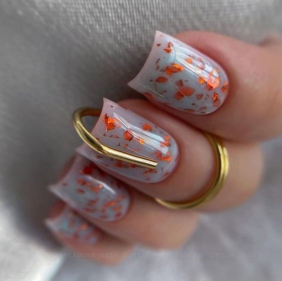 For the bride who finds beauty in understated luxury, here lies the splendor of gold flake accents on a sheer base. This design is a toast to bridesmaid’s elegance, echoing the warmth of fall weddings. The golden flakes are not just accents; they are the embodiment of cherished moments—a golden memory etched at the tips. It’s a super choice for those who adore a minimalist approach but desire a dash of festivity.