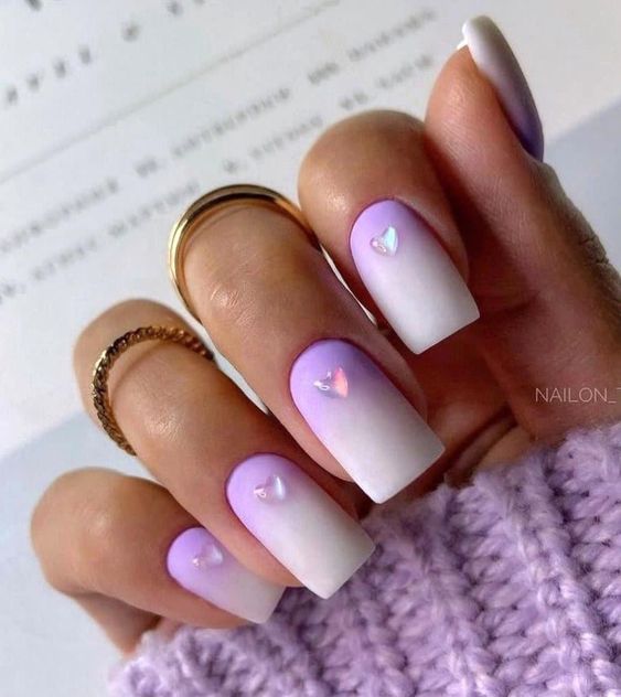 Soft pastel purple fades into white, creating a super natural ombre effect that’s both simple and elegant. Adorned with tiny hearts, these nails are a token of love, perfect for the romantic at heart. It’s a cute design that echoes the dreamy quality of brides in their ethereal gowns.