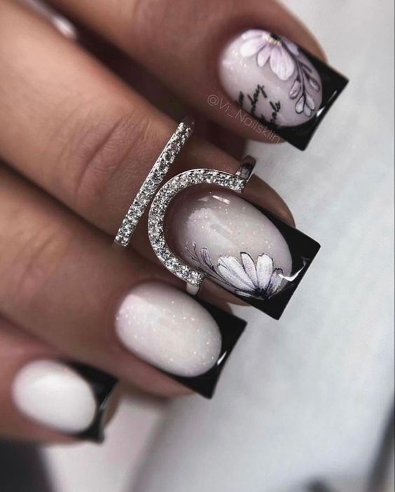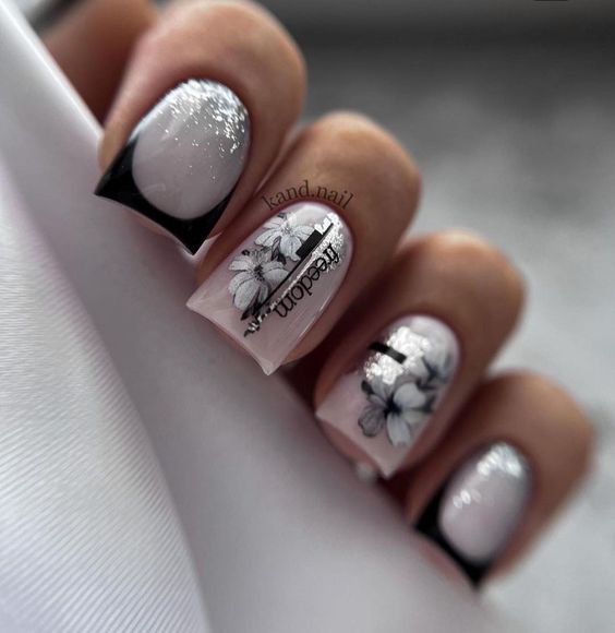 A striking contrast of black and white creates a magnetic allure. Floral motifs on a dark backdrop make each nail an artwork, akin to a midnight garden. This design is a dream for those who embrace a goth aesthetic, offering a classic yet bold interpretation of wedding nails short. It’s a choice that speaks of a bride’s confidence and her embrace of the unconventional.