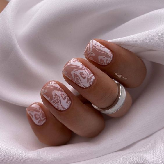 Abstract marbling with whispers of white and hints of earthy tones create a mesmerizing effect, ideal for the bride classy bridal look. Each swirl is as unique as the bride’s journey, symbolizing the intertwining paths of two lives. This gel design offers a modern twist on the French manicure gel, retaining the classic nature while introducing a contemporary art form.