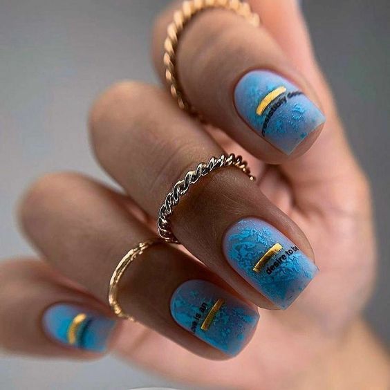 Vibrant shades of blue mixed with gold tell a tale of adventure and discovery, perfect for the bride who carries a wanderlust spirit. This gelish artwork, adorned with golden stripes, reflects the beauty of a clear sky meeting the endless sea. It’s a statement of boldness and freedom, a super selection for a beach wedding or a simple yet distinctive look.