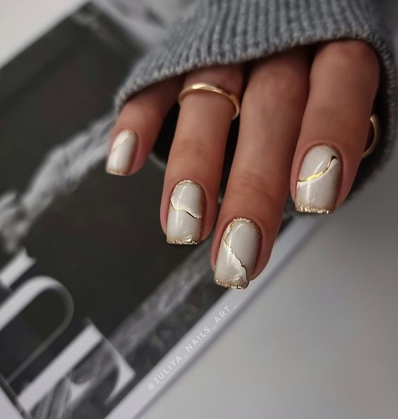The combination of ivory and gold in this design is nothing short of regal. The gilded edges add a luxurious feel, suitable for a royal blue or gold-themed wedding. This look is all about Art design for bride, offering a classy bridal french appearance with a bold, modern edge. It’s a statement choice for a bride who embodies grace and grandeur.