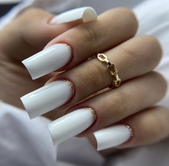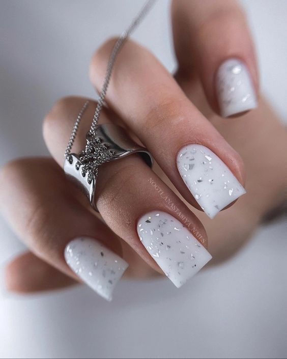 Reminiscent of a gentle winter snowfall, these white nails with subtle glitter capture the serenity of a winter wedding. The short length ensures comfort, while the sparkling flecks reflect the Classy bridal short trend with an air of enchantment.