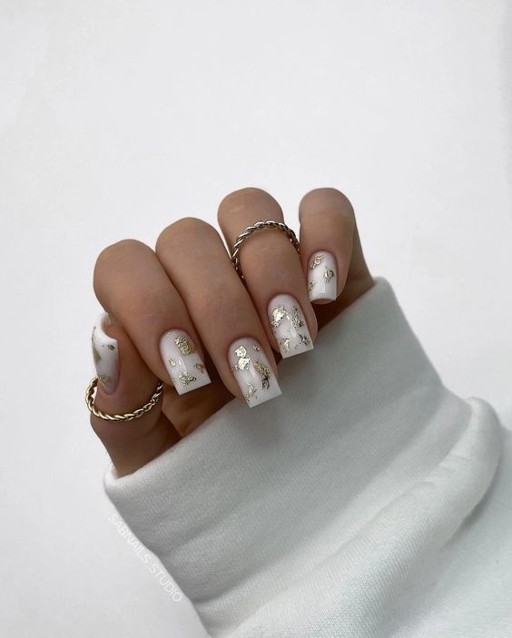 Creamy nails with golden crescents and speckles evoke the warmth of a rustic romance. This art for bride design combines a natural look with a dash of glamour, fitting for a bridal theme that celebrates both earthiness and elegance.