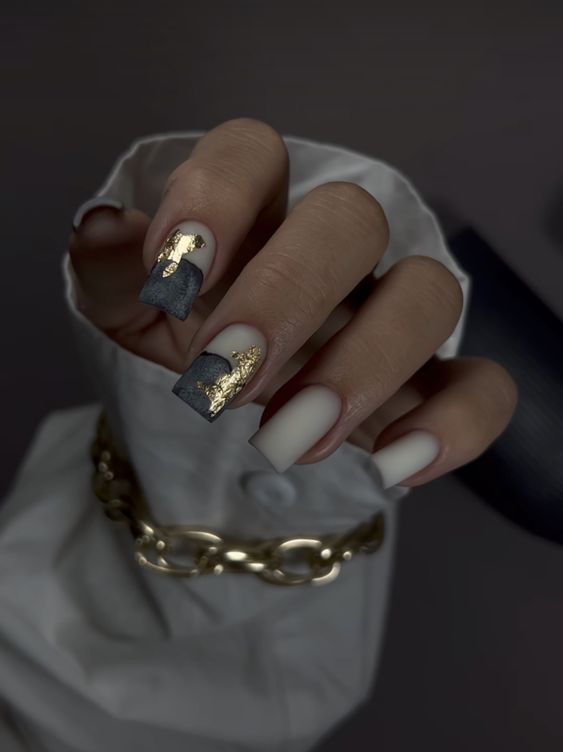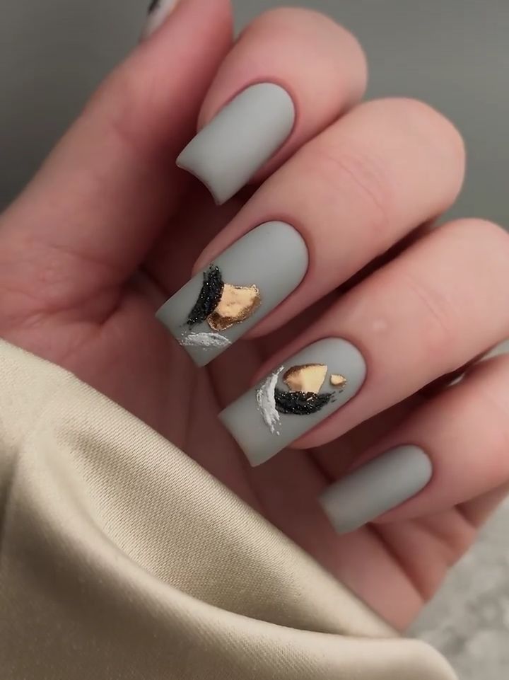 A captivating combination of matte gray and metallic accents, this nail design epitomizes modern bridal sophistication. The abstract art evokes a design elegant vibe with its gold and silver strokes, adding a unique sparkle and dimension. Ideal for the for bride classy bridal sparkle theme, it’s a luxurious choice for the avant-garde bride, daring to be different.