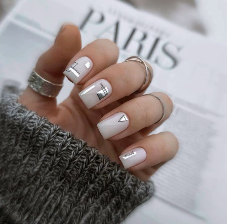 For the bride who adores simple sophistication, this minimalist design boasts clean lines and geometric shapes on a white canvas. The subtle inclusion of text adds a contemporary vibe, aligned with 2023 trends. This style is fitting for a classy bridal short nail, exuding elegance without overwhelming, and perfect for bridesmaids seeking an elegant touch to their attire.