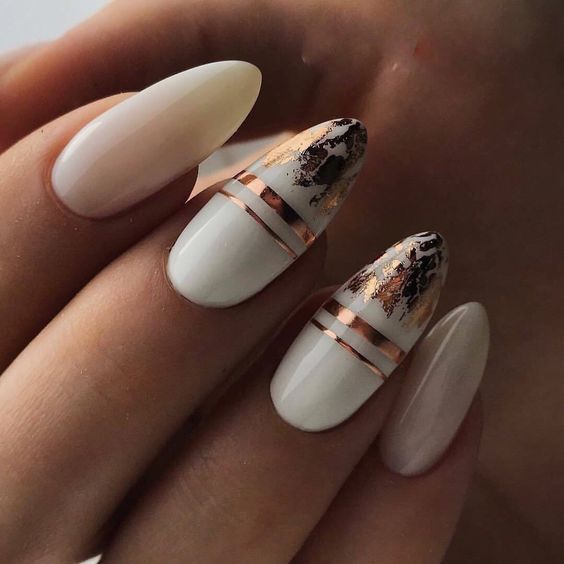 This design takes the breath away with its white and translucent marbling effect, interspersed with gold leaf accents. Ideal for keywords such as for the bride almond and gold, it represents a blend of nature-inspired beauty and luxury. The elongated stiletto shape adds drama and sophistication, making these nails a work of art fit for a momentous occasion. They would complement a wedding dress with gold beading or embroidery, bringing together a harmonious bridal look.