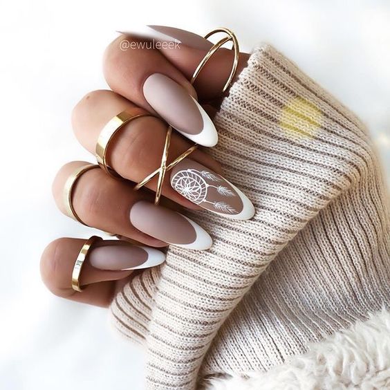 Bohemian style meets bridal chic in this unique manicure. Matte taupe nails serve as the foundation for a striking white dreamcatcher design, with select nails featuring a bold gold stripe. This look resonates with keywords such as for the bride french tip and for the bride ombre. The design is versatile enough to suit a variety of wedding themes, from a relaxed beach ceremony to a rustic countryside affair. Pair with a lace dress and gold accessories for a cohesive bohemian ensemble.