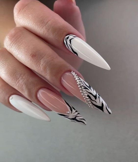Bold and artistic, this manicure makes a statement with its striking black and white marbled effect, punctuated by a band of rhinestones for added sparkle. This design resonates with keywords such as for the bride acrylic and for the bride stiletto, suitable for the bride who dares to be different. The contrast of the monochrome pattern with the traditional white wedding attire would create a captivating visual interest.